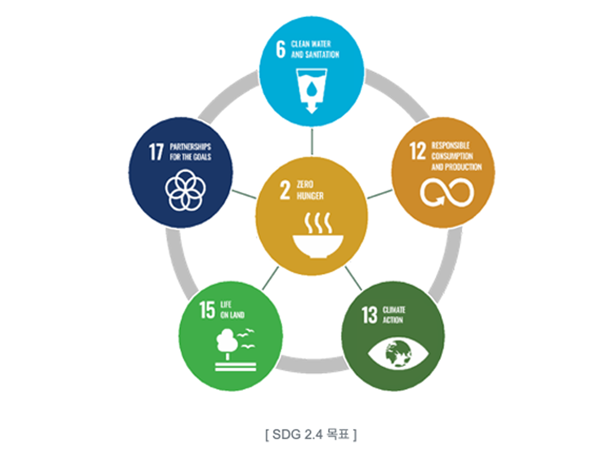SDG 2.4는 2030년까지 지속가능한 식량생산 시스템을 보장하고, 생산성과 생산량을 늘리고, 생태계를 유지하고, 기후변화, 극한 날씨, 가뭄, 홍수 및 기타 재해에 대한 적응 능력을 강화함과 더불어 토지와 토양의 질을 점진적으로 개선하는 탄력적인 농업 관행을 구현해야 한다고 말하고 있습니다.
