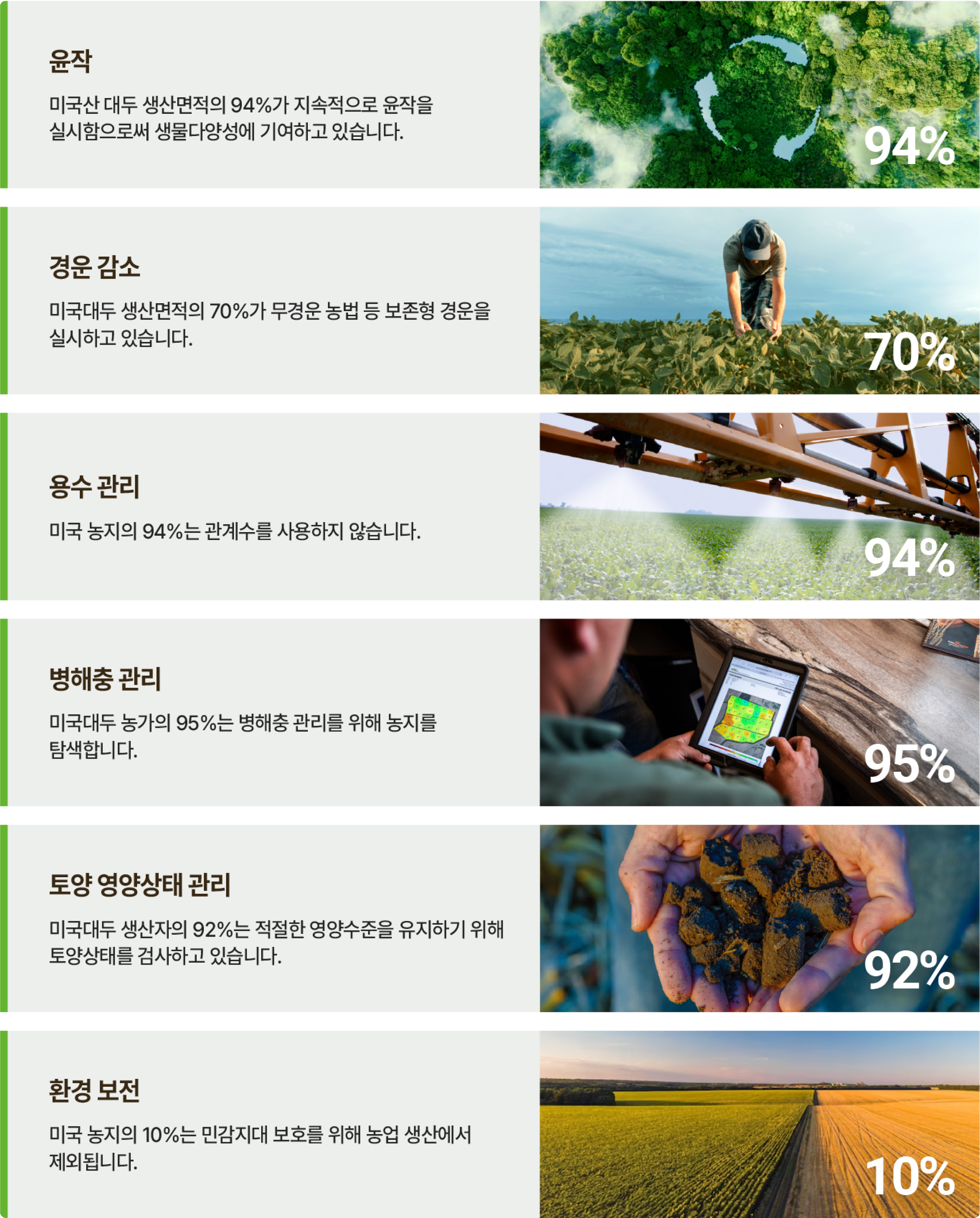 미국대두는 지속가능성에 대한 국가 차원의 관리와 토지 보전법에 기반해 물과 에너지 사용량을 줄이고