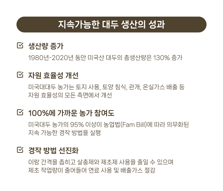 미국의 대두 생산자들은 윤작, 수자원 관리, 무경운 (땅을 갈아엎지 않고 파종) 농법, 해충 관리, 토양 영양 관리, 야생 동식물 보존 등의 노력을 해오고 있고, 그에 따라 아래와 같은 성과를 이루었습니다.