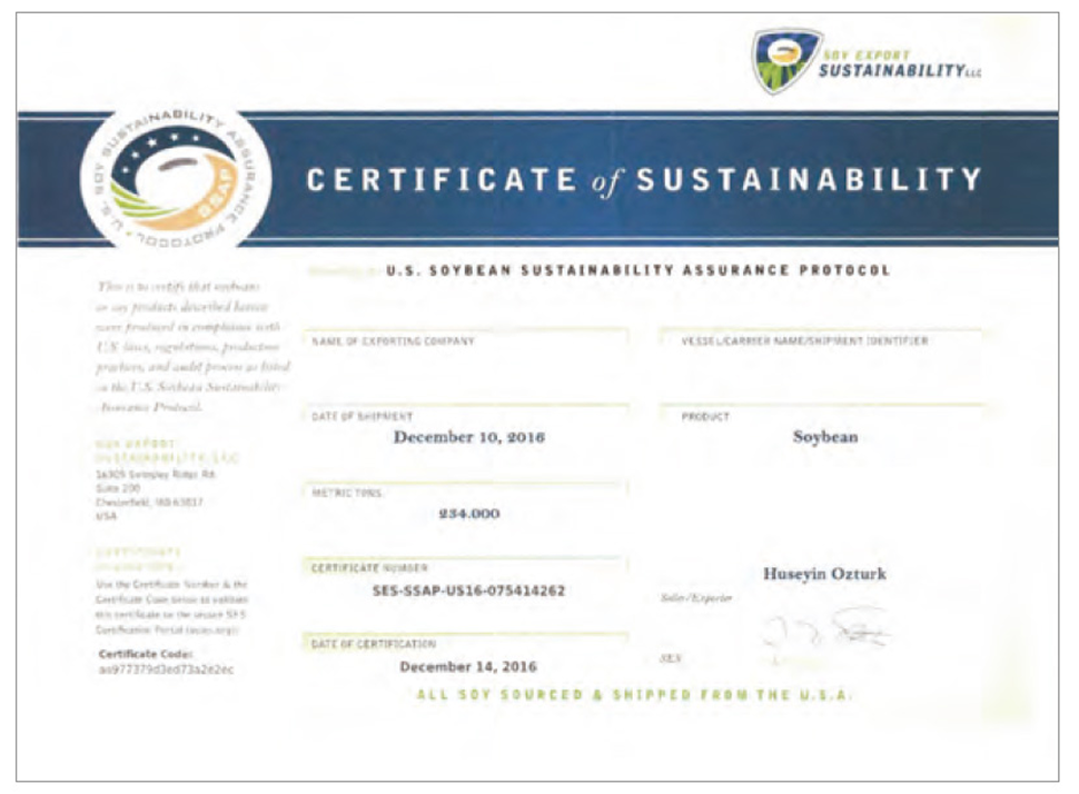SSAP 인증을 받은 대두는 위와 같은 인증서를 발급받게 됩니다. 2013년부터 우리나라에서 수입하는 미국산 대두에도 미국대두 지속가능성 인증서가 발급, 우리는 신뢰할 수 있는 미국산 대두를 만나고 있습니다.