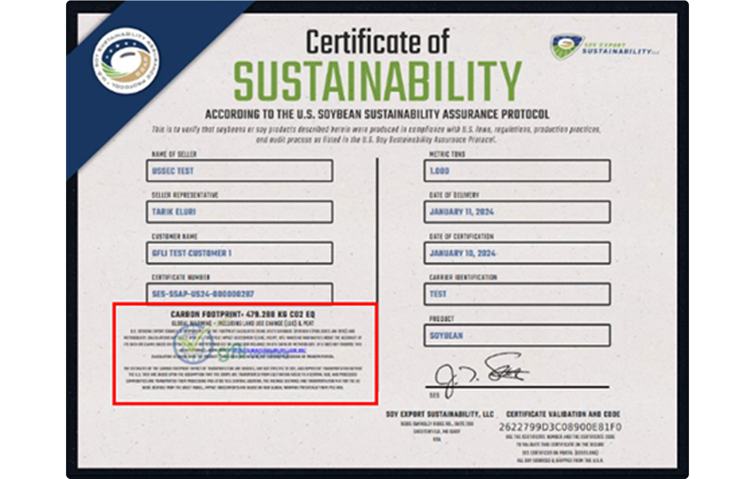 최근에는 지속가능한 농법으로 미국대두를 생산하는 미국대두농가들의 노력을 평가하고 비즈니스 가치를 도출하기 위해 GFLI 데이터를 활용해 탄소발자국을 산출하는 데 사용하고 있습니다. 또한 SSAP 인증서에는 GFLI를 활용한 탄소발자국이 기입돼 있어 미국대두에 대한 지속가능성을 보증하는 한편 소비자들에게 더욱 신뢰도를 높이고 있습니다.