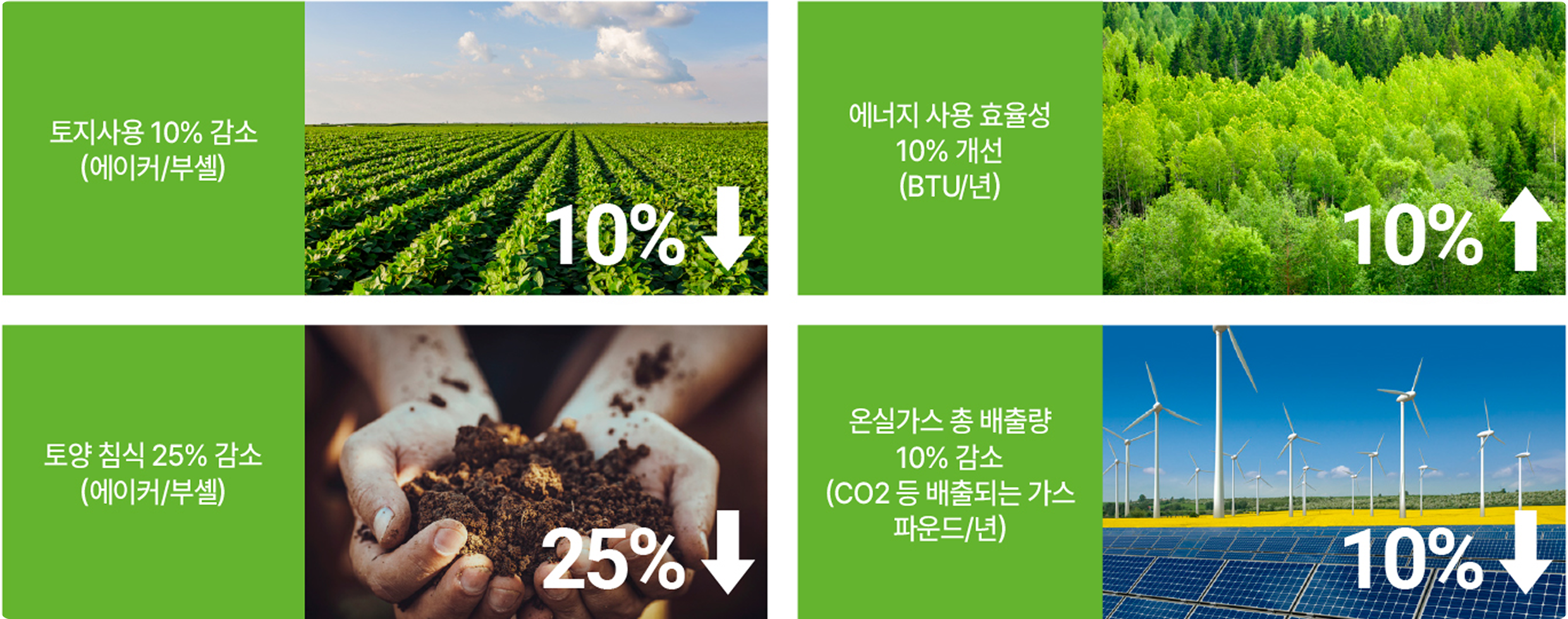 2014년 미국대두 생산 농가들은 2025년까지 토지사용율 10%, 토양 침식 25%, 온실가스 배출량 10%를 감축하겠다는 목표를 발표했습니다. 또한 에너지 사용 효율은 10% 향상하겠다는 계획을 세웠고 이는 모두 성공을 눈앞에 두고 있습니다.