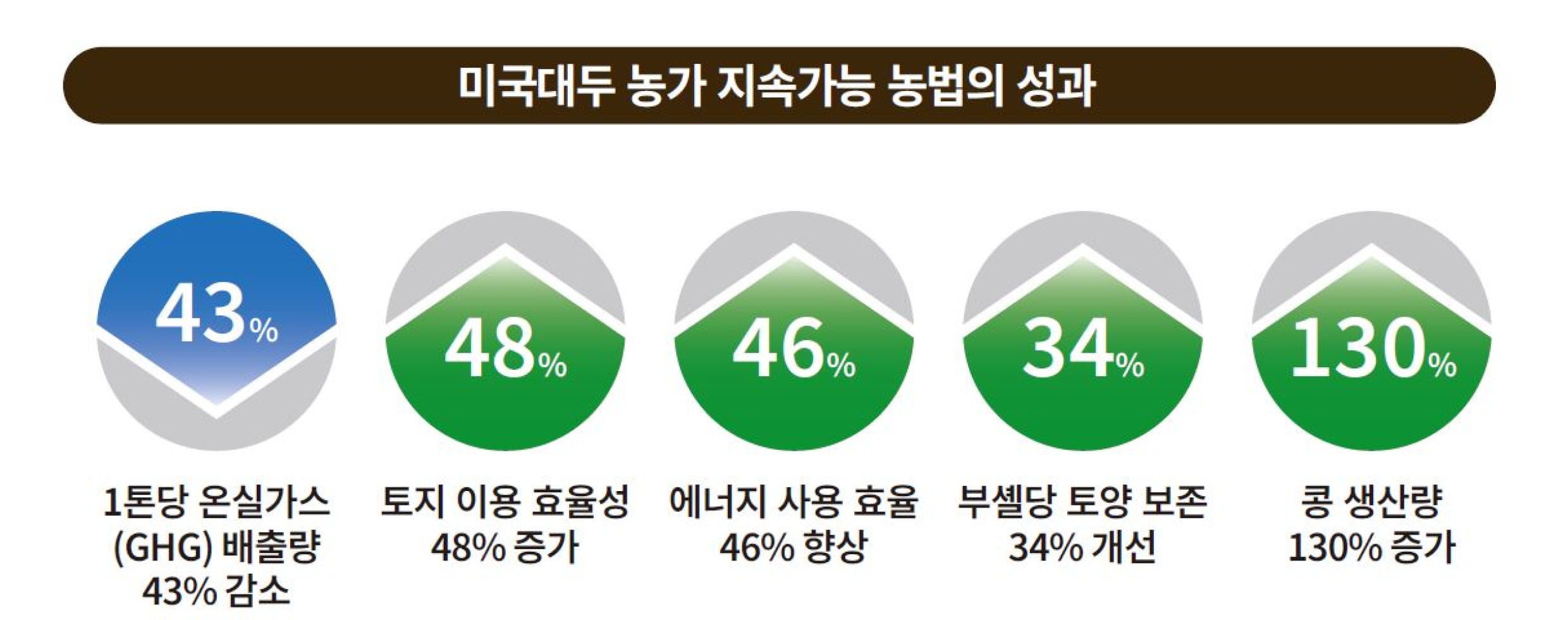미국의 대두 생산자들은 윤작, 수자원 관리, 무경운 (땅을 갈아엎지 않고 파종) 농법, 해충 관리, 토양 영양 관리, 야생 동식물 보존 등의 노력을 해오고 있고, 그에 따라 아래와 같은 성과를 이루었습니다.
